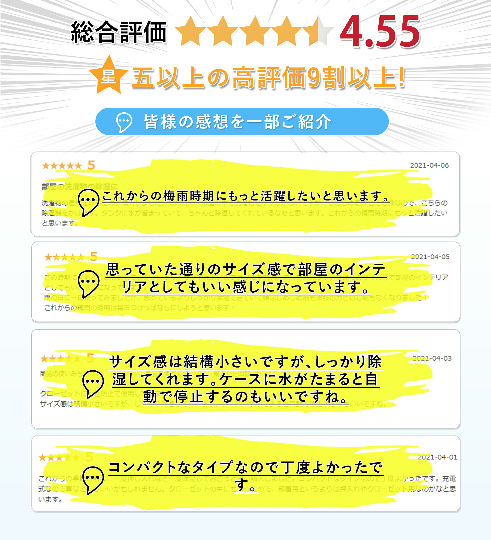 1日中最大300ml(34oz、温度:30℃、80%RHの環境にテスト結果)の湿気を迅速と効果的に除去できます。