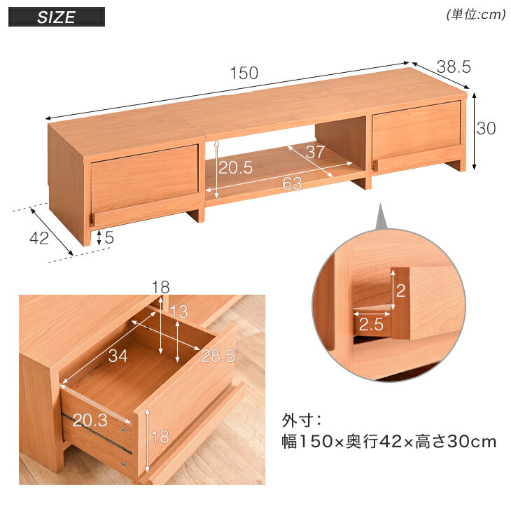 仕様サイズ 外寸:幅150×奥行42×高さ30cm 重量:約24kg 耐荷重 約40kg カラー ナチュラル、ブラウン 素材強化紙化粧繊維板 梱包サイズ 67.5x44.3x23.3cm備考 【組立品(大人2人で40分程度)】【マレーシア製】 ※配送は全て宅配便(1人)での玄関渡しとなります。